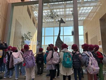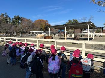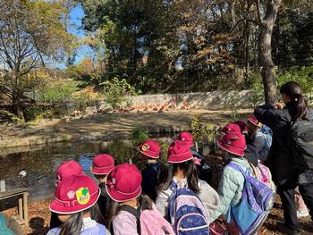 いいお天気に恵まれて、1年生が生活科見学に出かけています。東松山のこども動物自然公園で、まずはキリンやポニー、フラミンゴなどを見てまわります。